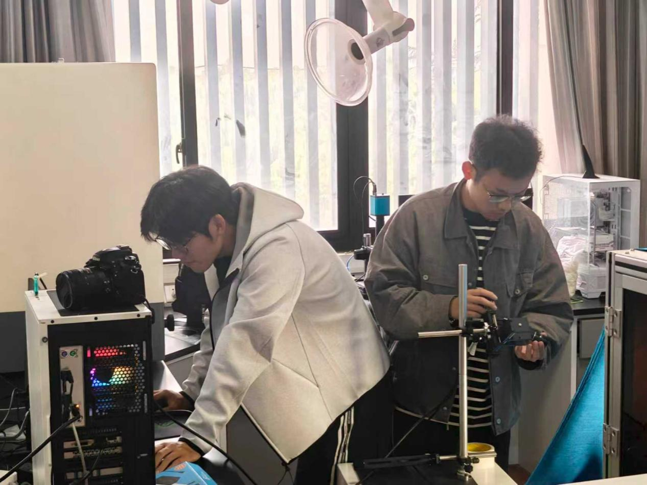 “我们的灵感,其实来源于纺织工厂认识实习的那段时光。”纺织科学与工程学院纺织工程231班李恒灏同学回忆起实习时看到验布台前的师傅们吃力地从各个角度看面料上的隐蔽瑕疵,这种辛苦低效的场景,让他们心里很不是滋味。也正因为如此,他们萌生了一个念头:能否将所学专业知识和AI技术结合,破解这个隐蔽瑕疵检测难题,提升面料检测效率?从有想法到做成,这条路可不好走。“最难的就是算法模型优化阶段。”李恒灏说,“模型识别准确率一直卡在85%,就像一道过不去的坎。团队在实验室里待了整整两个月,不停地调试算法,失败了好几百次,那种挫败感真让人难受。”但说到突破的那一刻,他眼睛都亮了:“还记得那天下午,我们调整了摄像头的安装方式和图片的拍摄角度,又在传统算法模型上加了新模块,隐蔽瑕疵识别准确率一下子涨到了97.4%。所有人都激动地跳了起来,之前的疲惫全忘了。
