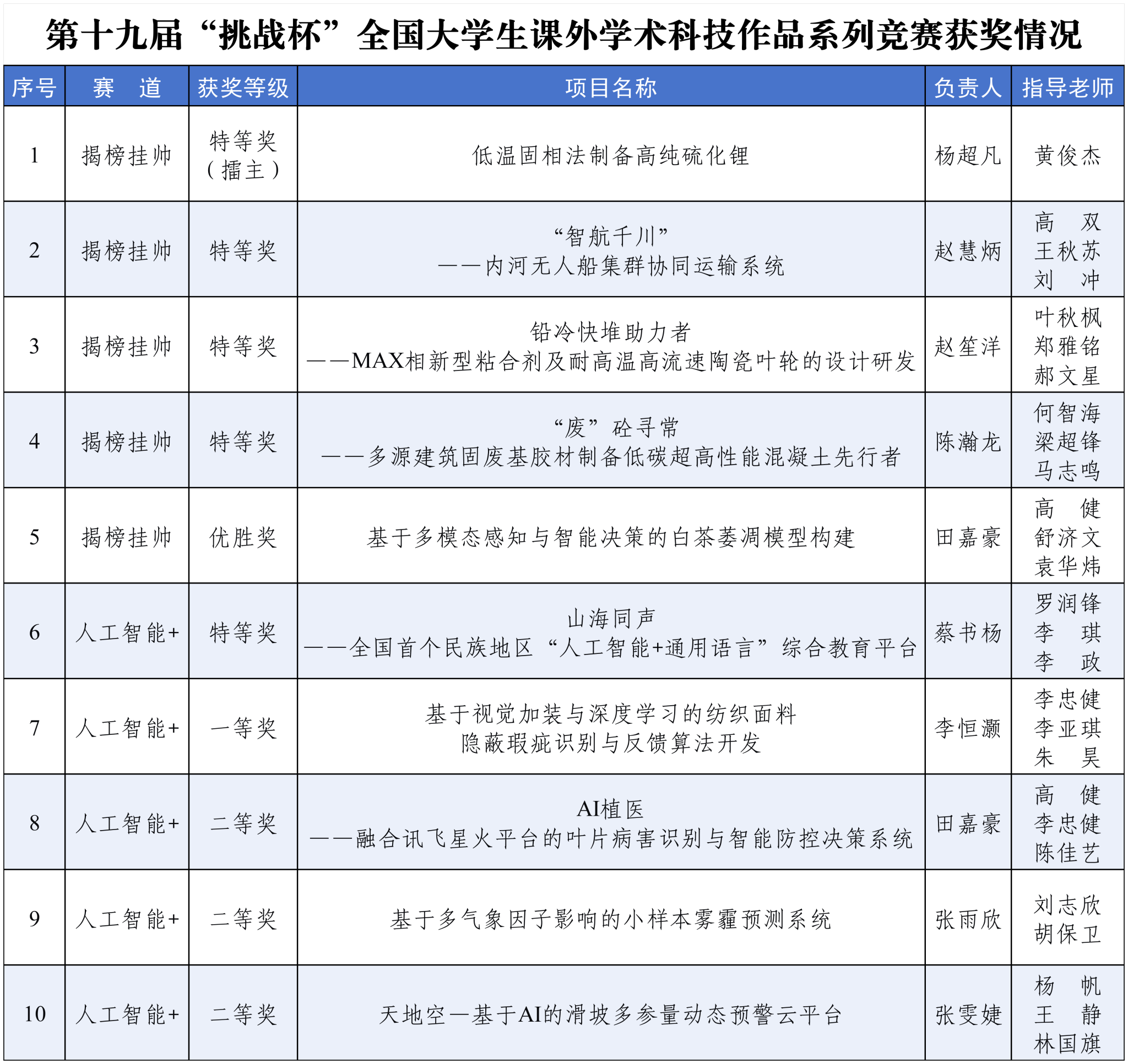 “挑战杯”全国大学生课外学术科技作品竞赛,被誉为当代中国大学生科技创新的“奥林匹克”盛会,已成功举办36年。本届竞赛突出科技创新紧扣产业前沿,设置了新一代信息技术、量子科技、新能源新材料等关键领域的主体赛,以及“揭榜挂帅”“人工智能+”专项赛,共有来自全国472所高校的1283件作品入围决赛。我校分别有5个项目入围“揭榜挂帅”擂台赛终审决赛、5个项目入围“人工智能+”专项赛终审决赛,共获特等奖5项(其中特等奖第一名擂主1项)、一等奖1项、二等奖3项、优秀奖1项。