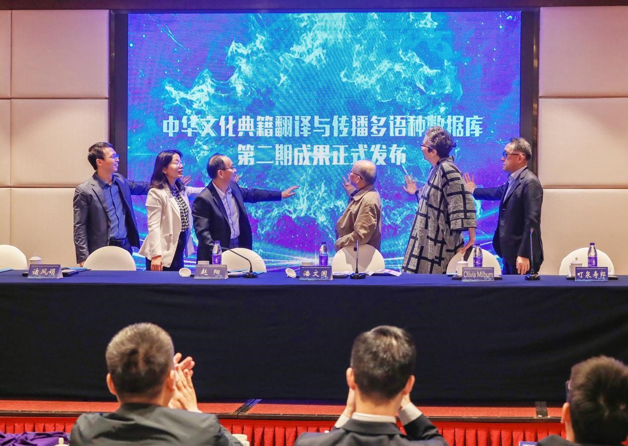 赵阳、人文社会科学处处长诸凤娟、外国语学院院长胡朋志、潘文国教授、Olivia Milburn 、町泉寿郎共同启动“中华文化典籍翻译与传播多语种数据库”第二期建设成果发布。