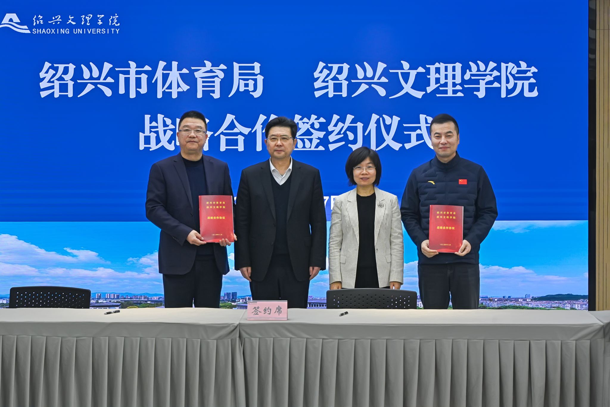 陈均土和赵腾飞分别代表绍兴文理学院和绍兴市体育局签订战略合作协议,张雪和崔凤军见证协议签署。