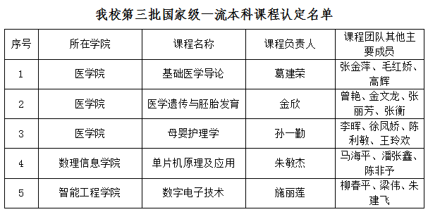 近日,教育部公布了第三批国家级一流本科课程认定名单,我校5门线上线下混合式课程获认定。至此,我校共计10门课程入选国家级一流本科课程,其中线下课程1门,线上线下混合式课程9门。国一流课程门数居省内同类高校前列。