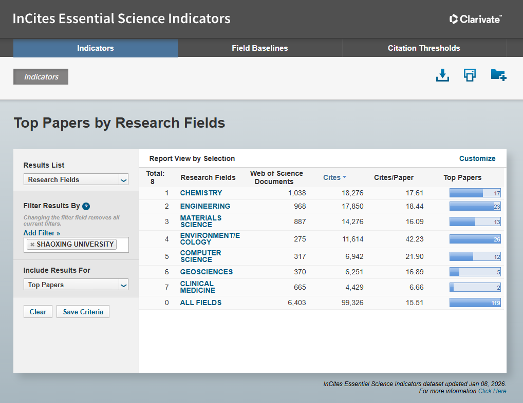 科睿唯安(Clarivate Analytics)近日发布了2026年1月ESI(基本科学指标数据库)最新数据。数据显示,我校地球科学(Geosciences)与临床医学(Clinical Medicine) 两个学科首次进入ESI全球前1%学科行列。