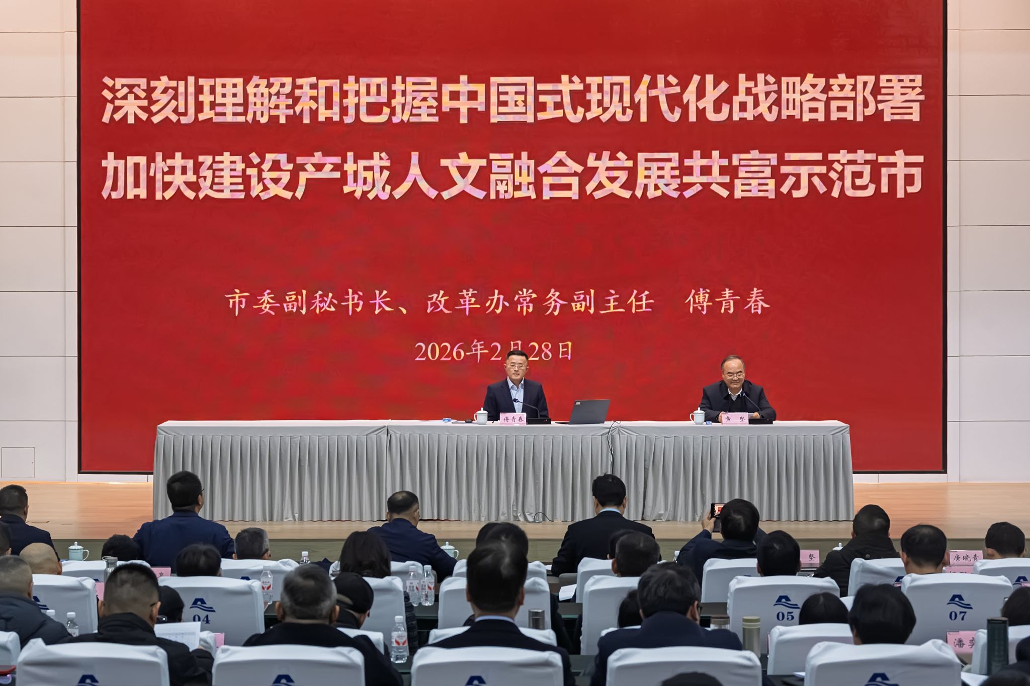 第二阶段是学习贯彻党的二十届四中全会精神集中轮训,采取“专家辅导+视频教学+集中自学”相结合的方式进行。校党委崔凤军书记围绕学习贯彻党的二十届四中全会、全国教育大会及省委十五届八次全会精神作专题辅导报告。报告深入阐释会议核心要义与战略部署,紧密结合学校实际,深刻剖析“学校不得不转型发展的现实考量”,进一步明晰“建设一所与绍兴城市地位相称的国内一流城市综合性大学”的愿景,明确“以产业—学科专业—学院一体化改革破除高质量发展瓶颈”的实践路径。市委副秘书长、改革办常务副主任傅青春应邀作《深刻理解和把握中国式现代化战略部署 加快建设产城人文融合发展共富示范市》专题报告。报告从“十五五”规划与中国式现代化的内在逻辑开篇,阐述“十五五”规划的历史方位与时代使命,紧密结合中国式现代化的五个重要特征和绍兴经济社会发展创新实践,深入解读绍兴市“十五五”时期发展规划。