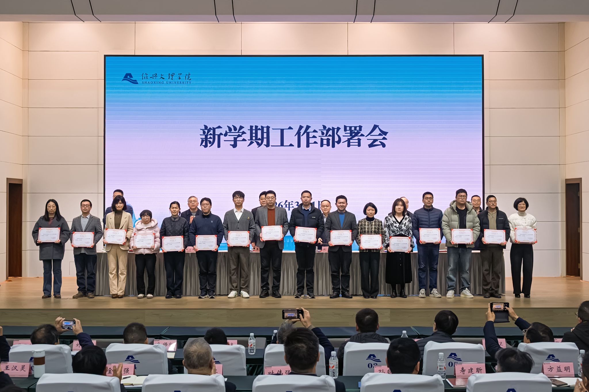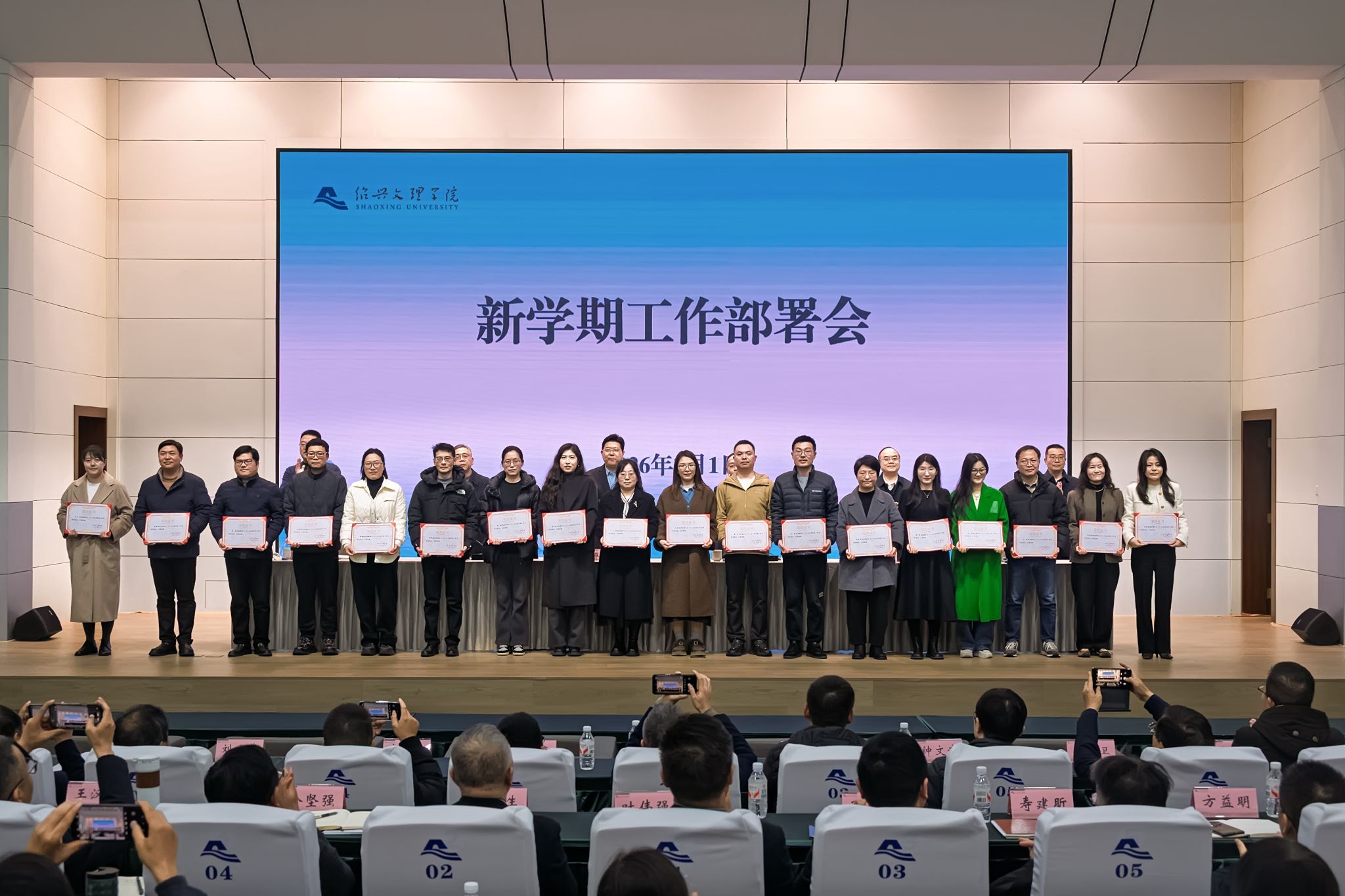 新学期工作部署会上,崔凤军简要回顾了学校寒假期间各项工作及成效,重点传达了省市“新春第一会”精神。他指出,省市“新春第一会”和全省教育系统工作会议传递的核心信号,就是“开局即决战、起步即冲刺”,这种只争朝夕、克难攻坚的奋斗姿态,正是我们当前最需要践行的精神品质。2026年是实施“十五五”发展规划、高质量建设绍兴大学的开局之年,是冲刺博士学位授予单位、实现办学层次跃升的决胜之年。要聚焦核心任务,攻坚突破进位,以实干实绩推动事业跃升,着力抓好八项重点工作:高标准制定实施“十五五”发展规划,全面启动“博士学位授予单位”攻坚行动,全力以赴争取“优质特色应用型本科院校和学科专业”建设资格,大力加强学科专业布局优化调整,扎实推进国家级教学成果奖申报工作,高质量完成教育评价改革国家试点工作,全面启动校地共生“双百工程”,守牢安全底线红线护航事业发展。