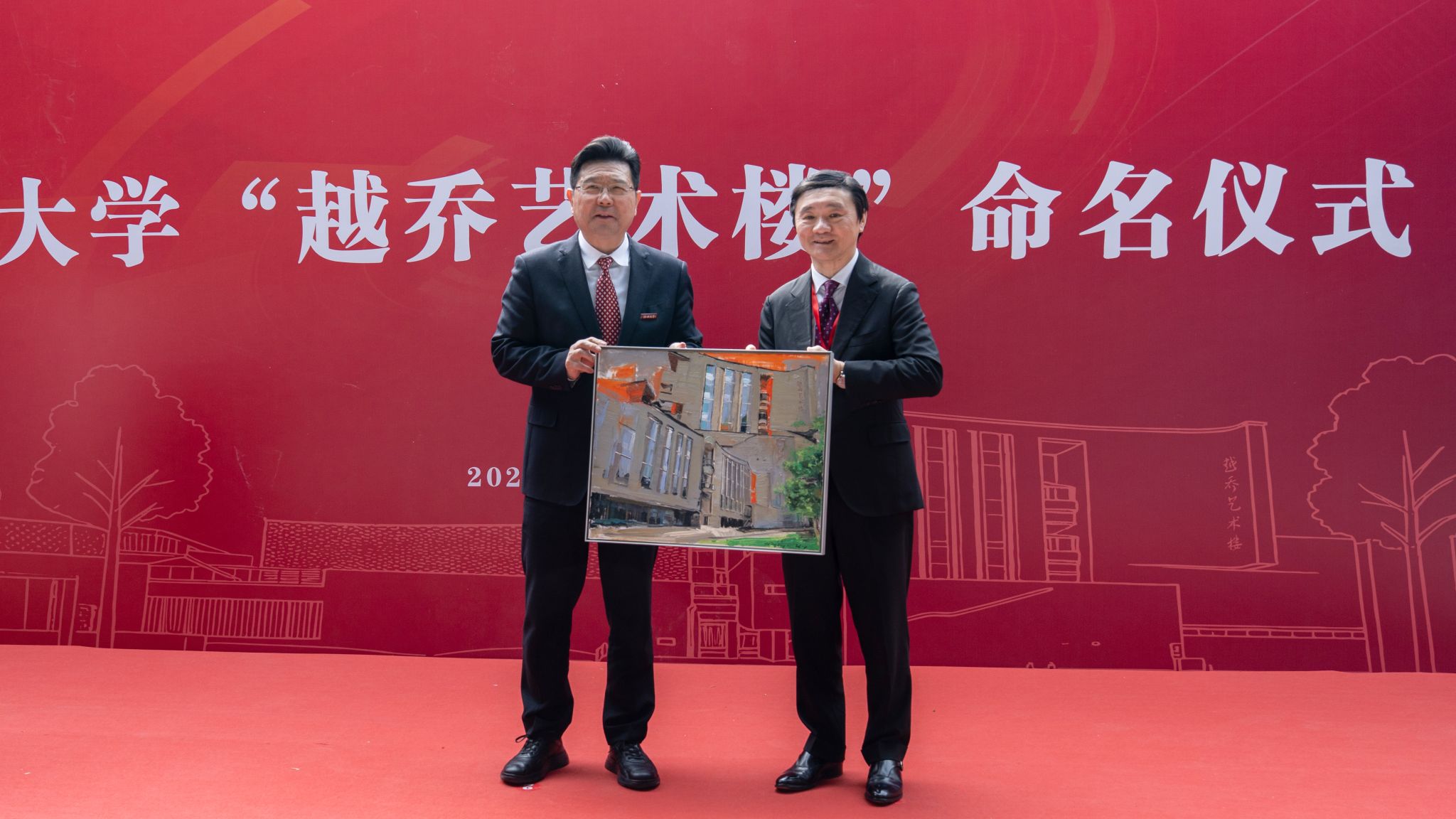崔凤军向车弘健赠送油画作品,并与车弘健共同为“越乔艺术楼”碑记揭幕,陈仲尼、单滨新共同见证。赵阳向车弘健颁发“绍兴大学发展委员会”副主席聘书。