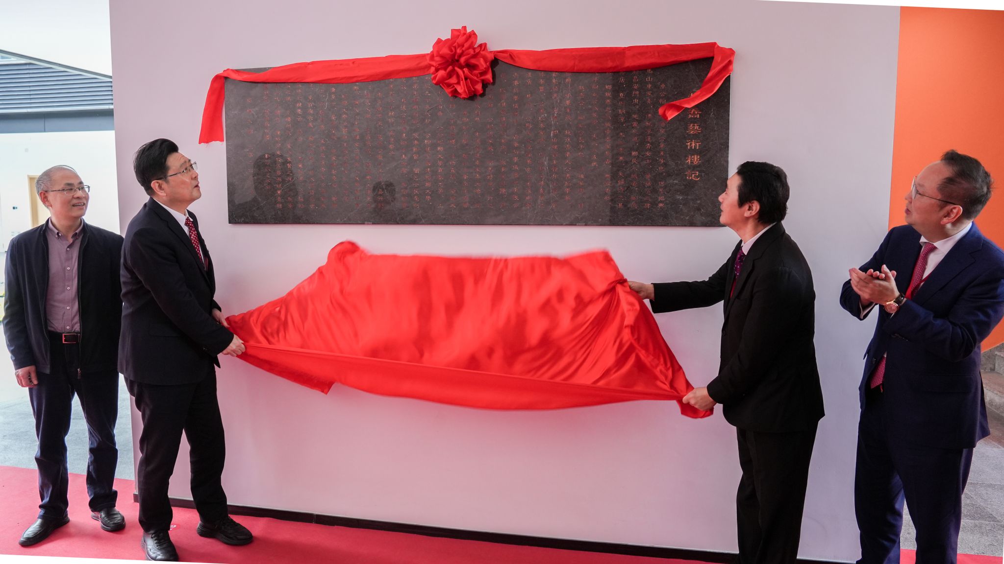 与会领导嘉宾为“越乔艺术楼”题名石揭幕,并合影留念。