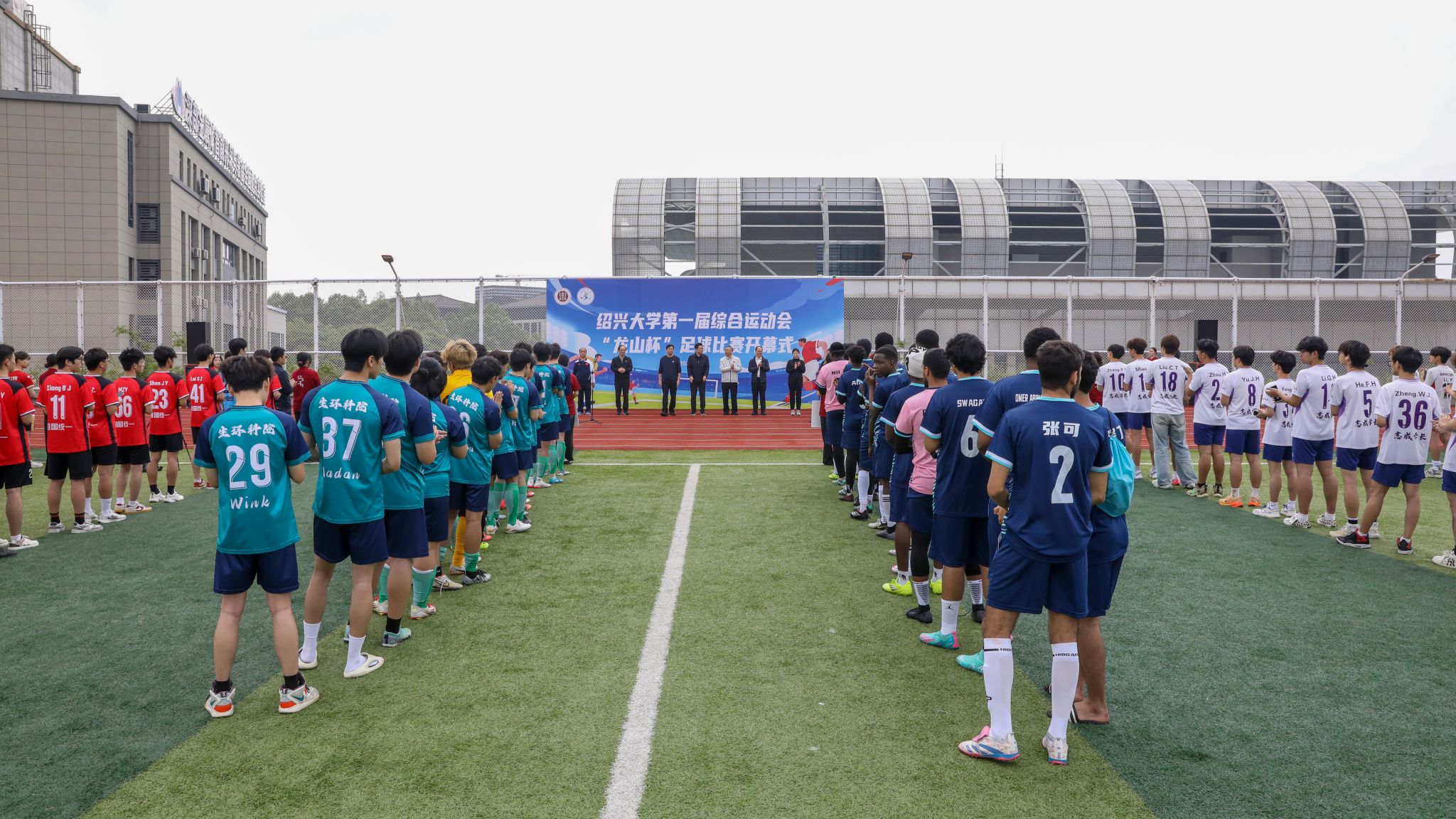 4月18日上午,绍兴大学第一届综合运动会“龙山杯”足球比赛开幕式在河西体育中心足球场举行。校党委书记崔凤军,副校长柳国庆,校党委委员、宣传部部长宋浩成等出席开幕式,崔凤军宣布比赛开幕,柳国庆为揭幕战开球。