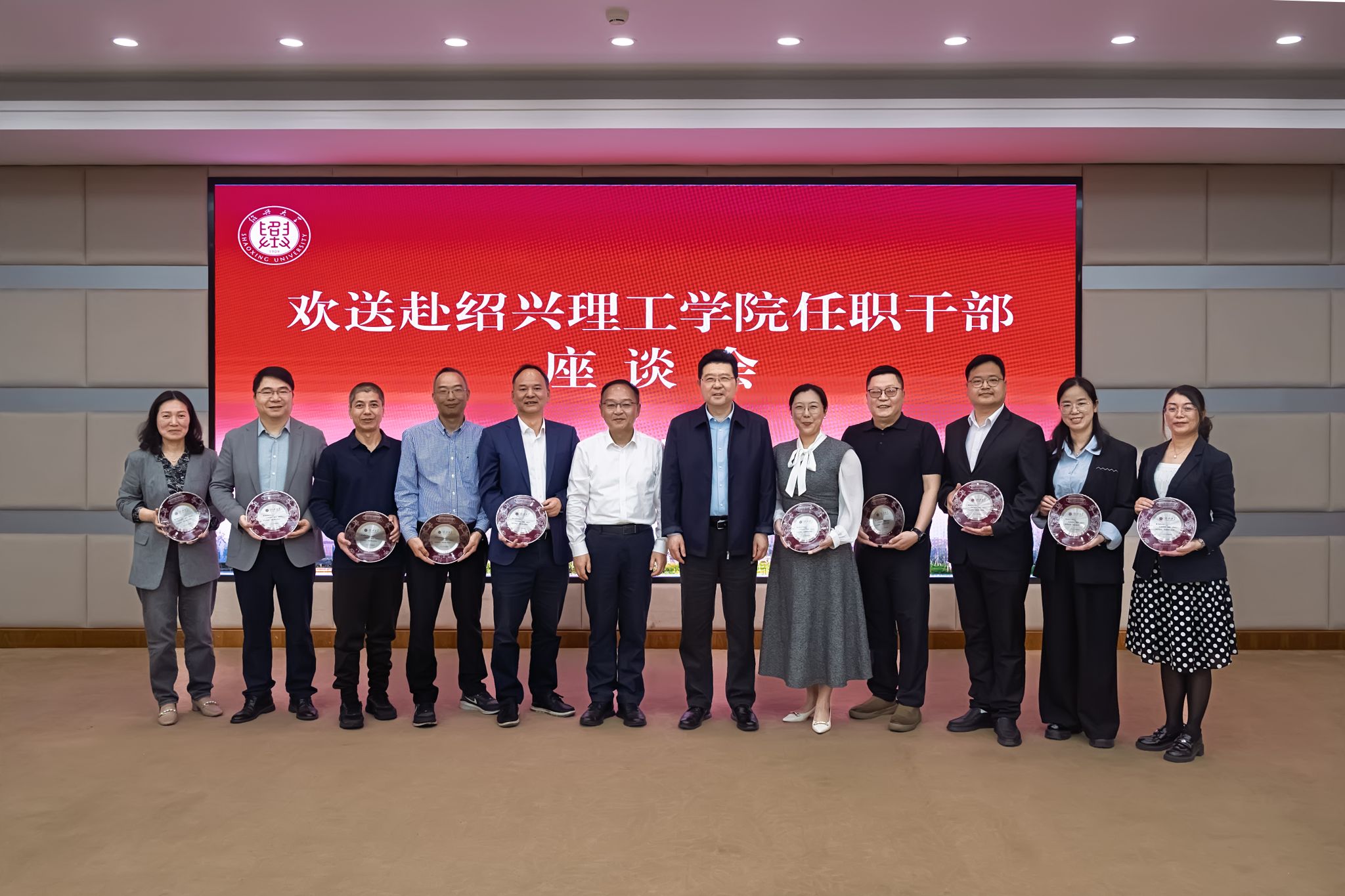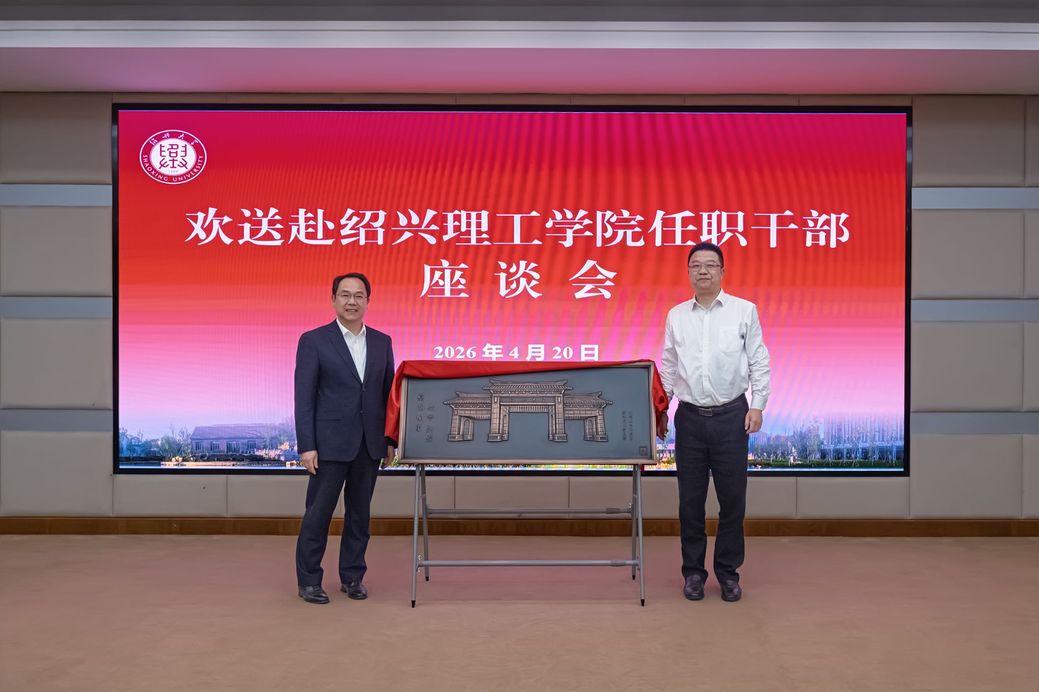 崔凤军、赵阳向调任干部代表颁发绍兴大学校友盘。梁瑜代表绍兴理工学院向学校赠送揭牌庆贺铜雕《根脉相系 共誉新程》,副校长陈均土代表学校接受捐赠。