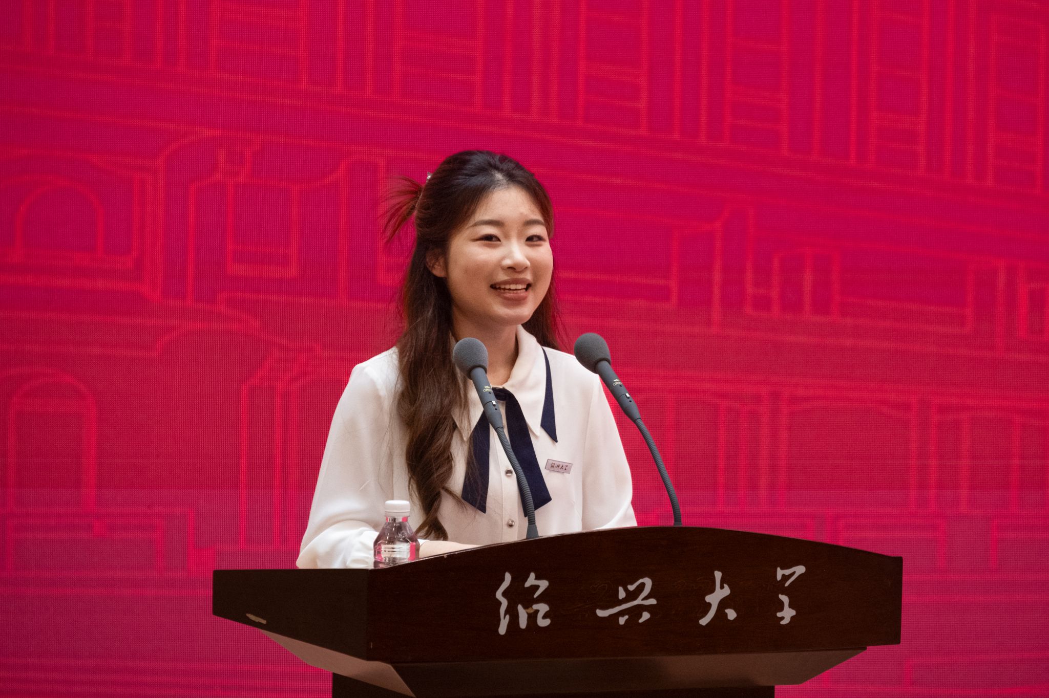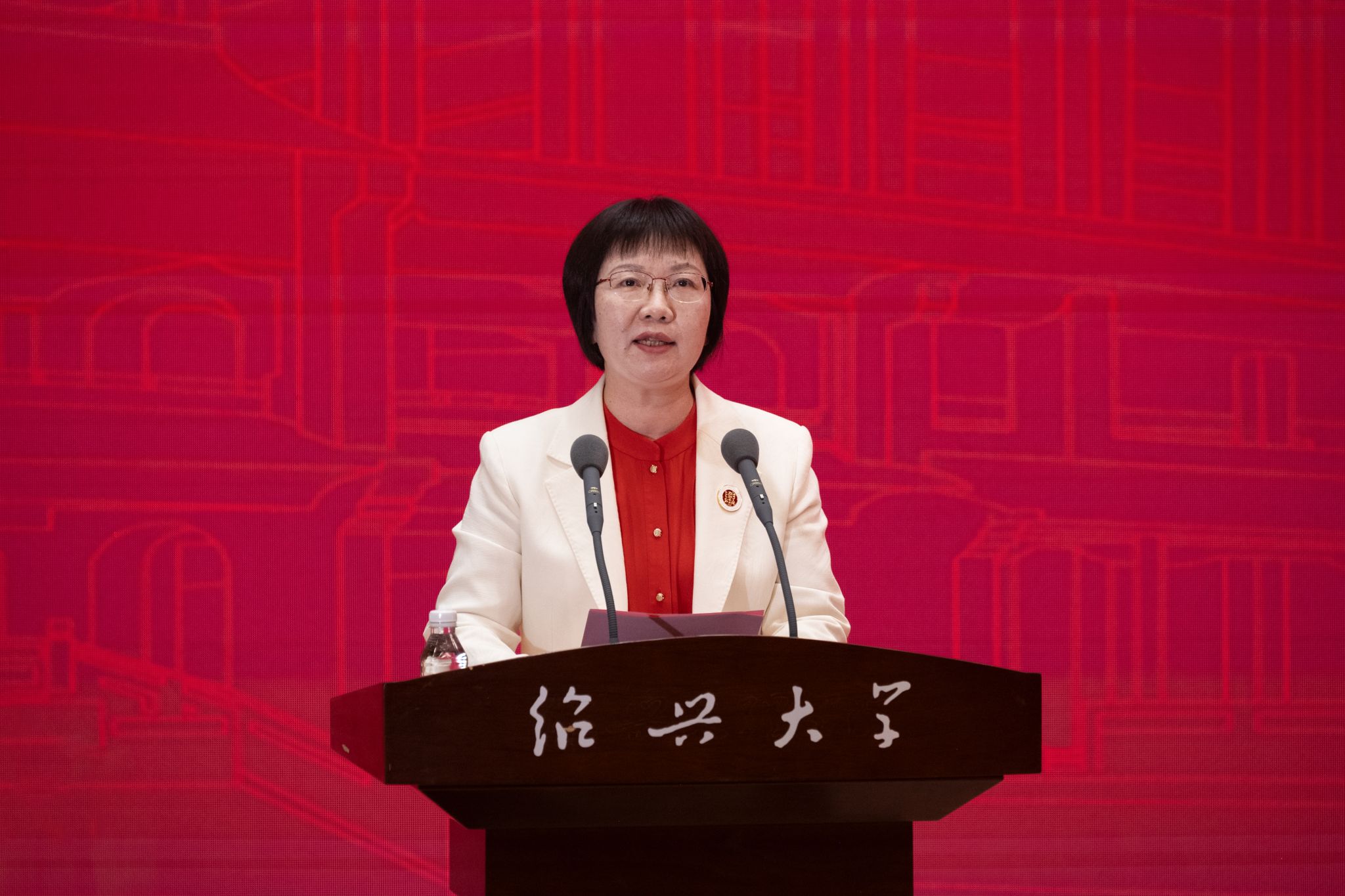获奖教师代表施丽莲发言,回顾从教三十载、亲历并见证学校升格为绍兴大学的历程,表示将把荣誉化为责任、把感激化为动力,不断更新教育理念、提升教学能力,助力更多青年学子成长成才。