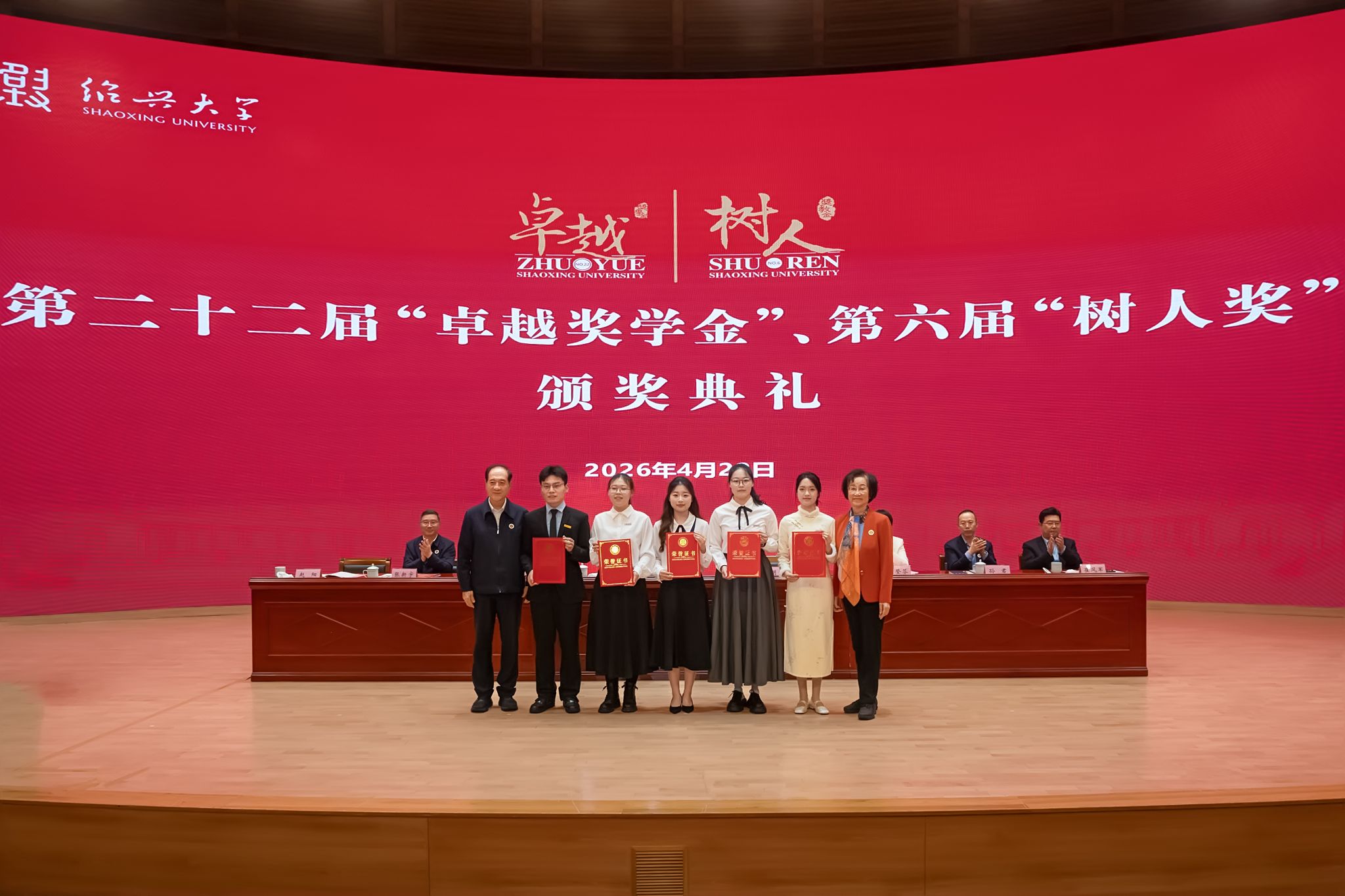 四月的校园,春和景明,万物向新。4月22日上午,绍兴大学第二十二届“卓越奖学金”、第六届“树人奖”颁奖典礼隆重举行。“卓越奖学基金”“树人奖教基金”倡设者、第十二届全国政协副主席、中国科协名誉主席、中国科学院韩启德院士,北京大学燕京学堂名誉院长、北京大学国际关系学院袁明教授出席颁奖典礼并为获奖师生颁奖。省政协副秘书长、九三学社省委会专职副主委、一级巡视员丁晓燕,市长吴登芬,市政协党组书记、主席张新宇,副市长孙君,校党委书记崔凤军,校长赵阳出席颁奖典礼并在主席台就座。