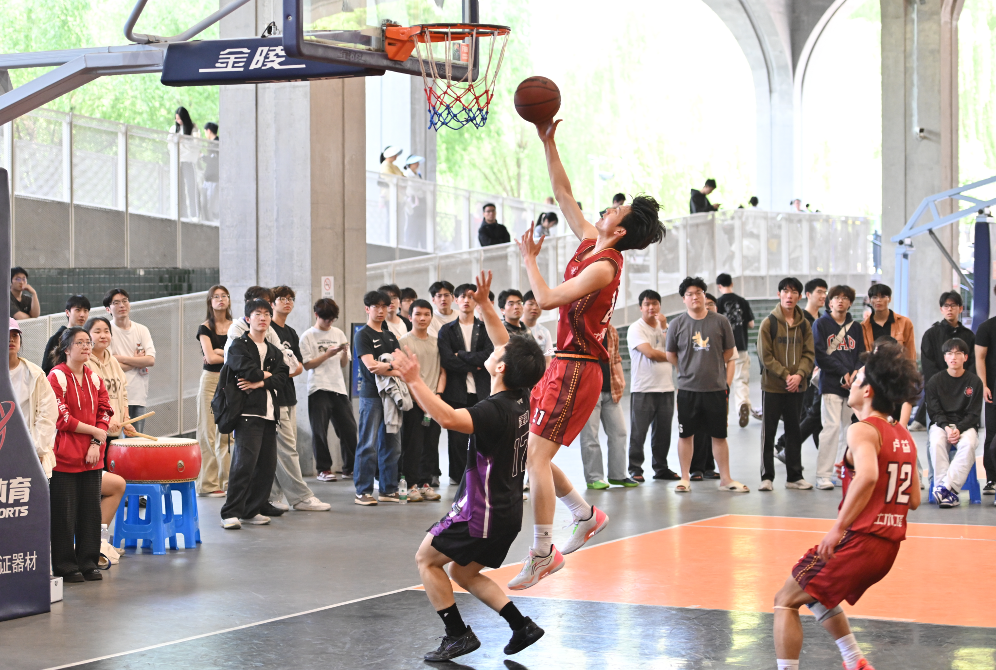 总决赛现场座无虚席,双方助威方阵口号整齐、鼓声雷动。男篮决赛中场休息期间,STEP街舞社为大家带来了一段活力四射的舞蹈表演。随后进行的三分球大赛中,宋浩成和三位三分王进行了现场互动比赛,宋浩成命中精彩进球后全场掌声不断。崔凤军为吴嘉琦、周锦志、翁桢期三位三分王赠上亲笔签名篮球,并合影留念。