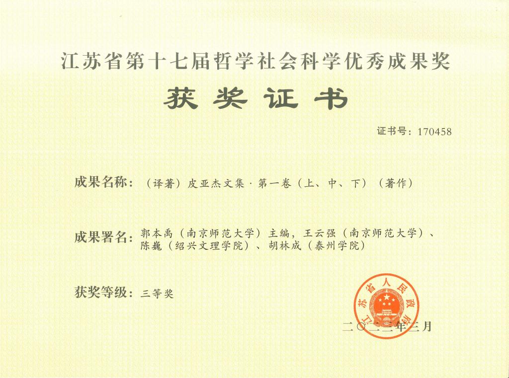 近期,江苏省人民政府正式发布了《关于公布江苏省第十七届哲学社会科学优秀成果奖的决定》(苏政发〔2023〕21号),我校教师教育学院心理学系教师陈巍教授作为副主编,与南京师范大学郭本禹教授等合作编纂的《皮亚杰文集》第一卷(上、中、下)获江苏省第十七届哲学社会科学优秀成果三等奖(排名第三,我校为第二署名单位)。江苏省哲学社会科学优秀成果奖由江苏省人民政府设立,是江苏省哲学社会科学界规格最高的政府奖,每两年评选一次。此次评奖,共授予750个项目江苏省第十七届哲学社会科学优秀成果奖,其中,一等奖120项、二等奖300项、三等奖330项。