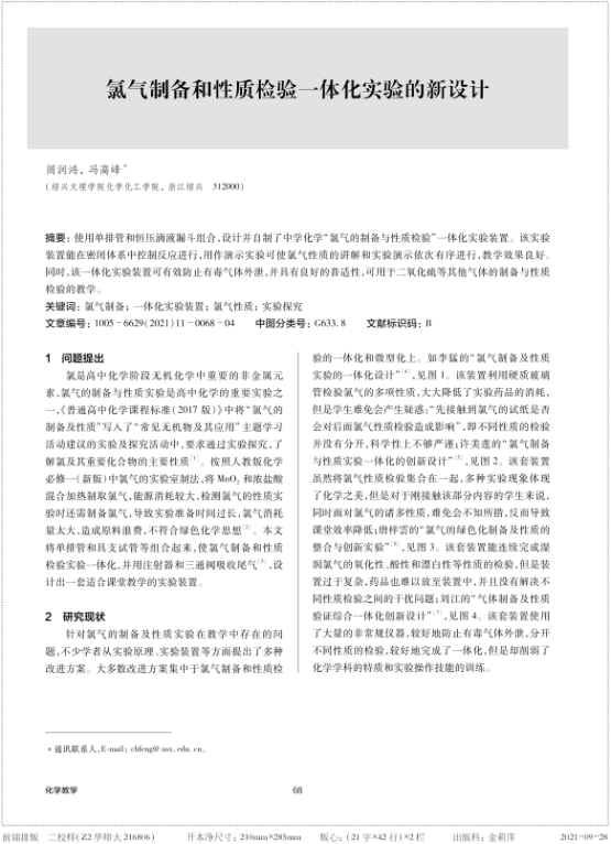 冯高峰教授指导的另一个学科教学(化学)研究生阎润鸿前期也在《化学教学》发表了一篇题为“氯气制备和性质检验一体化实验的新设计”的研究论文。论文创新应用科研所用双排管和恒压滴液漏斗等,实现了氯气制备的可控性和性质检验的有序性,增加了实验的安全性、提高了教学效果。
