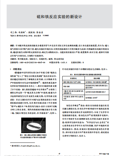 近期,我校化学化工学院学科教学(化学)专业硕士研究生司二伟在导师冯高峰教授指导下以第一作者在化学教育领域核心期刊《化学教学》上发表题为“硫和铁反应实验的新设计”的研究论文。论文创新实验设计,排除氧气在硫与铁反应中的干扰等,增加科学实验的严谨性,体现了科学探究、创新意识、科学态度等化学教学核心素养培养。