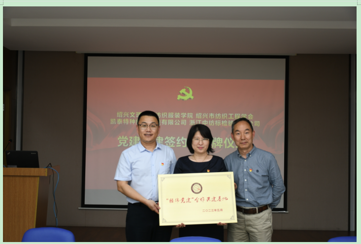 会上,纺织服装学院、绍兴市纺织工程学会共同与凯泰特种纤维科技有限公司、浙江中纺标检验有限公司签订党建共建合作协议,并为“共同富裕 乡村振兴”实践教育基地揭牌。