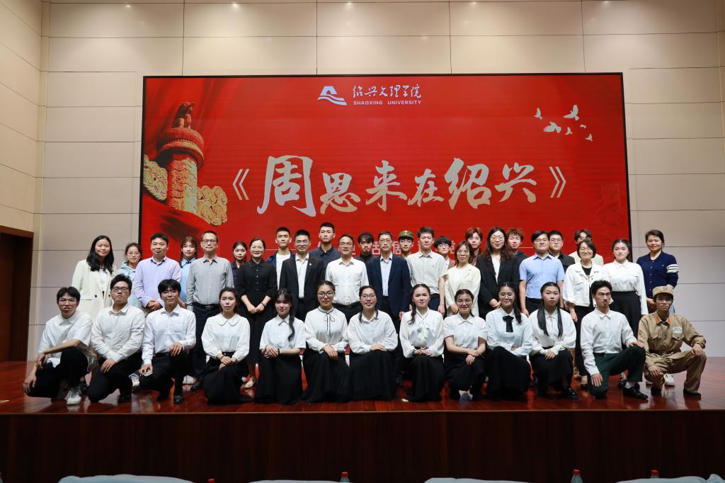 为纪念周恩来总理诞辰125周年,5月22日晚,由绍兴文理学院阳明剧社创排的话剧《周恩来在绍兴》在铁城科教馆报告厅首演。本次活动由校组织部、宣传部、团委主办,人文学院、公共艺术部承办,人文学院和校大学生公共艺术部共同承办,人文学院第一学生党支部和红色之乡红色文化传承与传播团队协办。中共绍兴市委党史研究室主任朱全红、副主任朱伟明、宣教处副处长凌艳,国网绍兴供电公司团委书记董冬阳,塔山街道党委委员、文联主席谢春丽,校组织部、宣传部、纪检监察室、人文学院、国际教育学院等负责人,学校第44期预备党员培训班学员、人文学院学生党员300余人参加。