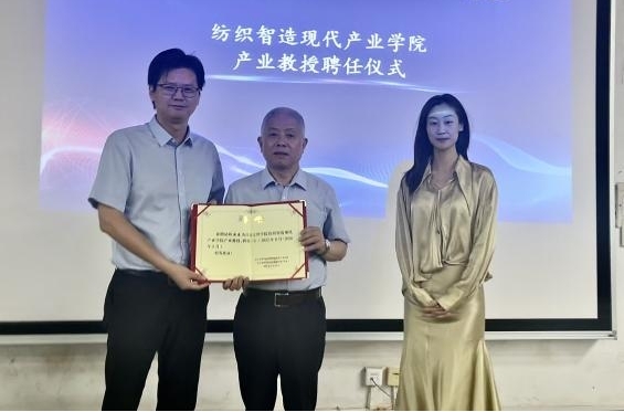 项目推介会现场,纺织服装学院副院长洪剑寒为钱国春颁发产业学院产业教授聘书。钱国春受邀在“业界精英进课堂”上分享了自己的创业故事。