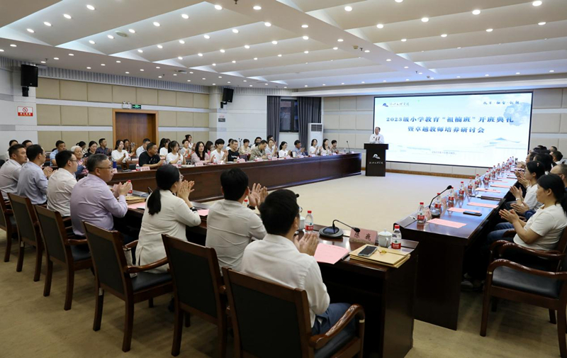 10月28日下午,绍兴文理学院2023级小学教育(师范)“祖楠班”开班典礼暨卓越教师培养研讨会在图书馆一楼报告厅举行。副校长柳国庆,市教育局高教处处长沈华梅,越城区教体局副局长王颖,越地教育名家周一贯,学校相关职能部处负责人、“祖楠班”全体学员、学员家长及“祖楠班”校内外导师出席参加典礼。典礼由教师教育学院党委书记罗润锋主持。