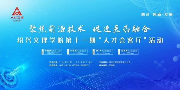 11月20日下午,第十一期“人才会客厅”活动在学校图书馆一楼“人才之家”举行。本期“人才会客厅”以“聚焦前沿技术,促进医药融合”为主题,由党委人才办主办,医学院承办,邀请齐康医学检验所有限公司孙爱静总经理,绍兴文理学院医学院药物制剂研究所所长朱柯武博士、化学化工学院蔡涛博士,绍兴文理学院附属医院药剂科沈男男副主任作主题发言。校人才办、医学院等20余人参加活动。