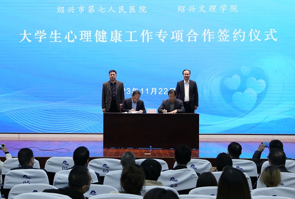 11月22日下午,我校与绍兴市第七人民医院在铁城科教馆就大学生心理健康工作专项合作举行签约仪式。绍兴市第七人民医院党委书记蒋新新、副院长钱建军等专家,校党委副书记张宏,学校二级学院党委副书记、研究生导师、辅导员、班级心理委员、寝室长等师生代表参加活动。学工部相关负责人主持活动。