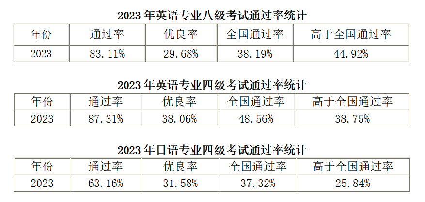 根据高校外语专业教学测试办公室提供的2023年英语专业四级和八级以及日语专业四级的考试数据,我校外国语学院学子在各项专业等级考试中表现出色,通过率远超全国平均水平,优良率较高。