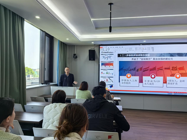 课程教研组组长宓才裕围绕“备、编、讲、研”四个方面,对本学期选定的“当前国际形势与中国的原则立场”“读懂中国式现代化与中华民族共同体意识”“经济高质量发展与就业政策”等教学模块内容进行深入浅出的解读和辅导,同时针对性地提出了教学建议。宣传部副部长刘灵娟对课程教研组的教学组织工作给予充分肯定,并提出“守好主阵地”的具体要求。