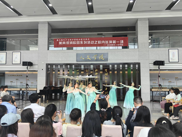 为活跃校园文化氛围,深化校园美育教育,促进不同学院之间的文化交流与融合,5月15日下午,蔡元培艺术与设计学院办学三十周年系列活动“美育浸润校园巡演第一场——走进南山”在鲁迅人文学院顺利举办,本次活动由蔡元培艺术与设计学院和鲁迅人文学院联合主办。副校长赵浪平,宣传部、蔡元培艺术与设计学院、鲁迅人文学院主要负责人参加活动,活动吸引了100余位师生到场欣赏。
