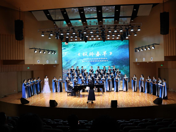 整场音乐会涵盖17首作品,由我校19位师生与台州学院师生携手完成。在演出过程中,双方师生紧密配合、用心演绎,充分展现了两校师生较高的艺术水准和良好的合作精神。其中,女生合唱《枫桥春早》由叶高峰指挥,台州学院行云合唱团演绎,该作品为我院原创合唱曲目,是浙江文化艺术发展基金资助项目和绍兴市文化资金创作扶持资助项目,该作品为整场音乐会画上了圆满的句号。