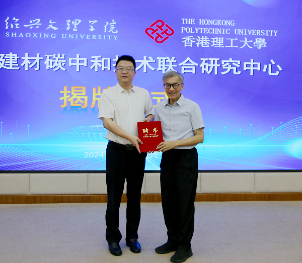 陈均土向潘智生颁发“绍兴文理学院-香港理工大学绿色建材碳中和技术联合研究中心”主任聘书。