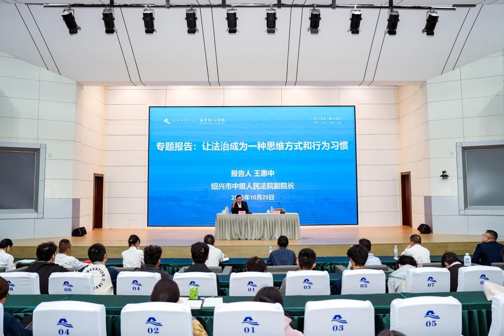 绍兴市中级人民法院副院长、二级高级法官王惠中围绕“让法治成为一种思维方式和行为习惯”作主题讲座。王惠中结合自身丰富的司法实践与教学经验,从庭审实战、裁判文书写作、合议庭思维等方面,系统阐释了法治思维从认知到实践、从个体能力到组织习惯的养成路径。讲座深入浅出、案例翔实,引发师生热烈反响。
