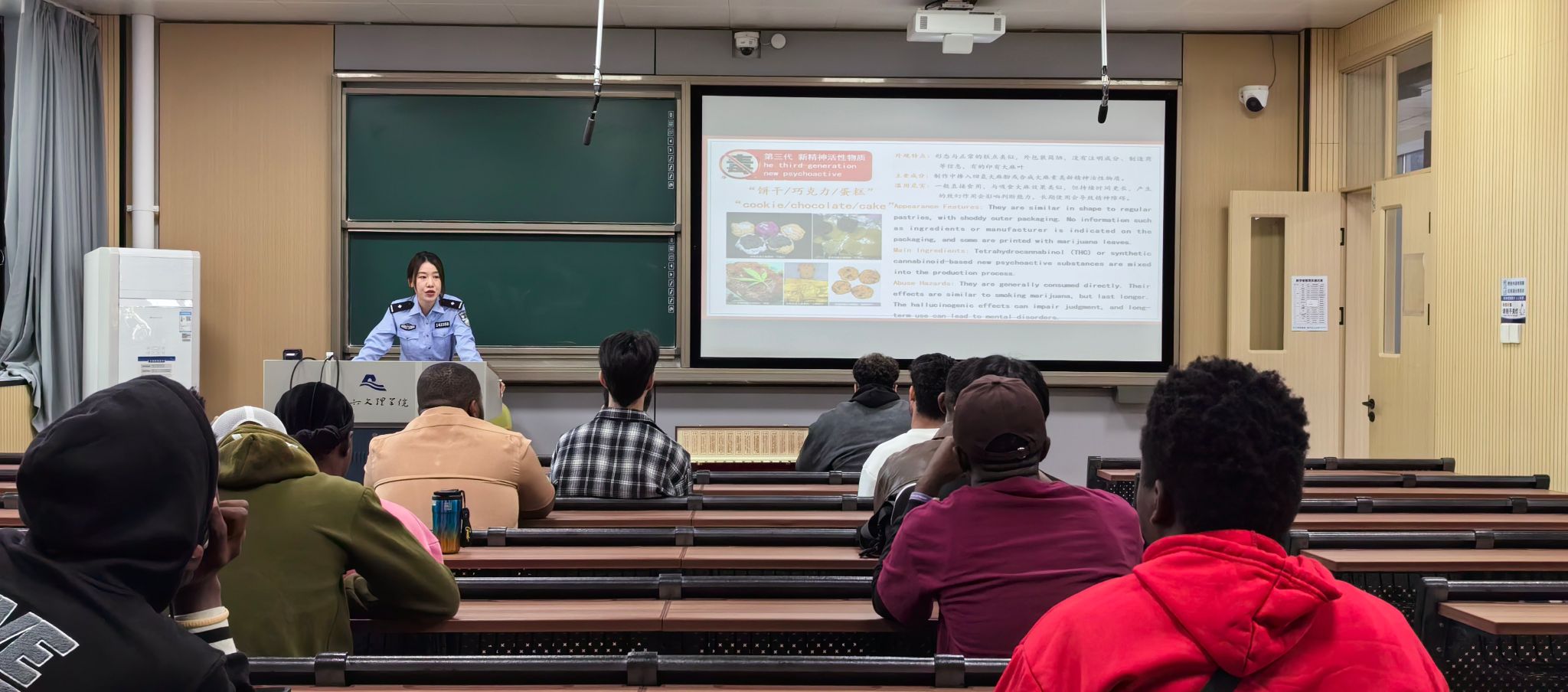 宣讲通过真实案例以案释法,剖析毒品对个人身心、家庭幸福及社会安全造成的严重危害,提醒同学们“远离毒品,从我做起”。潘警官还强调,留学生要遵守中国法律法规,牢固树立法治意识和自我保护意识,做到“不尝第一口、不信花言巧语、不为他人保管或投递可疑物品”,自觉抵制毒品诱惑,积极参与全民禁毒人民战争,共同营造健康无毒的校园环境。