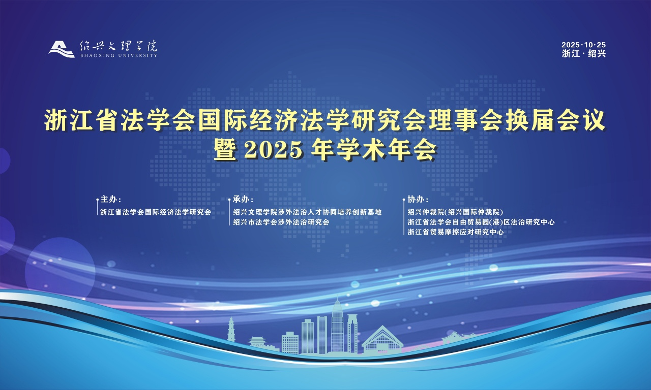 10月25日,浙江省法学会国际经济法学研究会理事会换届会议暨2025年学术年会在绍兴国际大酒店成功举行。本次会议以“高水平对外开放与国际经济法的创新发展”为主题,由浙江省法学会国际经济法学研究会主办,绍兴文理学院涉外法治人才协同培养创新基地、绍兴市法学会涉外法治研究会承办,绍兴仲裁院(绍兴国际仲裁院)等单位协办。