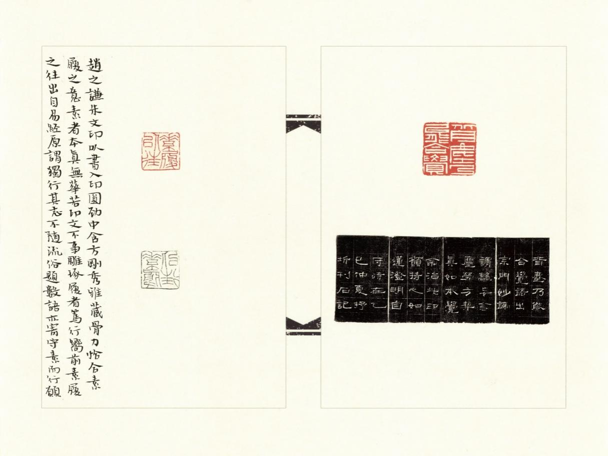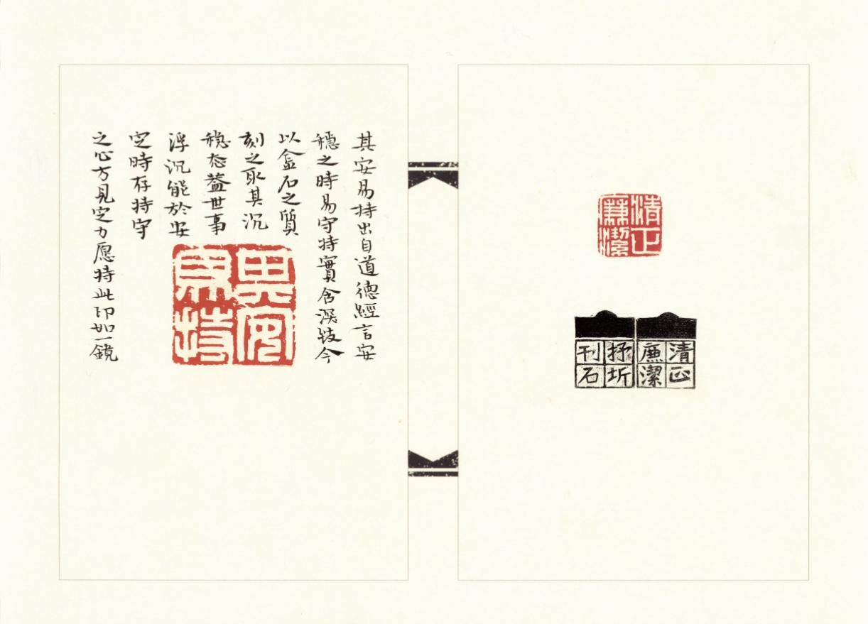 作品介绍:该印屏内容较为丰富,有以吴昌硕典型粗朱文风格的游于艺,也有赵之谦风格的朱文印,在白文印的创作中主要选择了以汉印为基,“清正廉洁”这方印在处理上加入了吴昌硕的典型风格,让此印看起来更为的古朴、苍劲。在创作过程中努力追求传统与个性的传统维度,并在有些印旁用魏晋小楷进行标注说明,增加了整个印评的丰富程度。