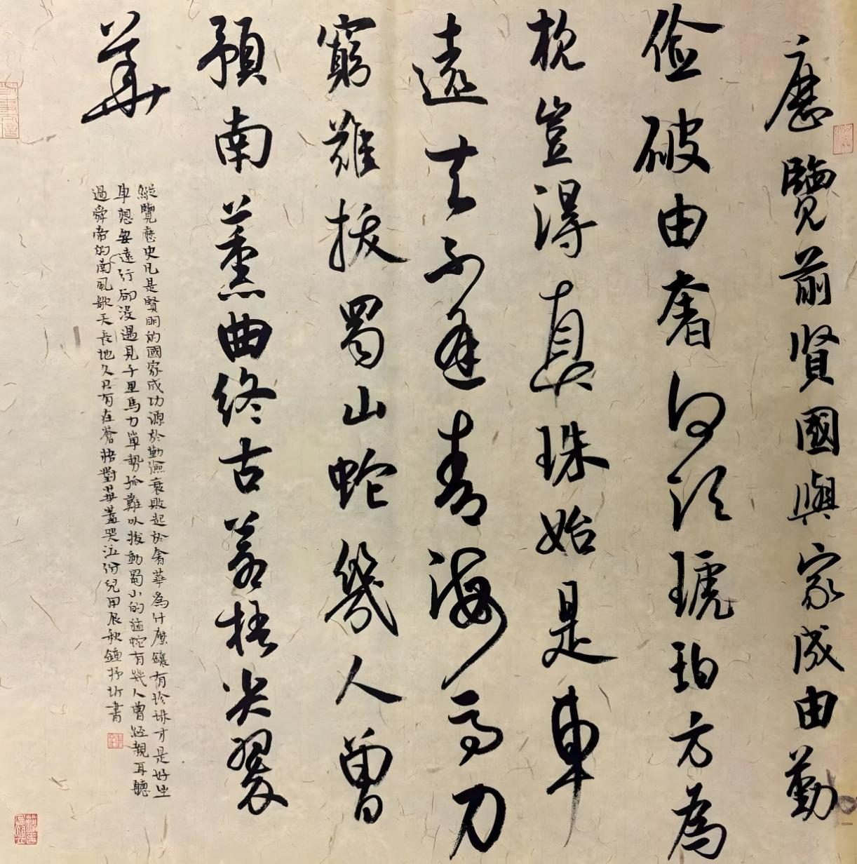 作品介绍:以李商隐的《咏史二首·其二》为正文行书创作内容,作品以“历览前贤国与家,成由勤俭破由奢”为起笔,振聋发聩的历史哲思需以沉稳厚重的笔势承载,整体布局上,采用纵有行、横无列的章法,行距疏密随诗意起伏,既保持行书的流畅气韵,又通过局部的欹侧呼应诗歌的跌宕情感,最后用魏晋小楷书写落款,对诗内容加以解释,也与正文的行书形成强烈对比。