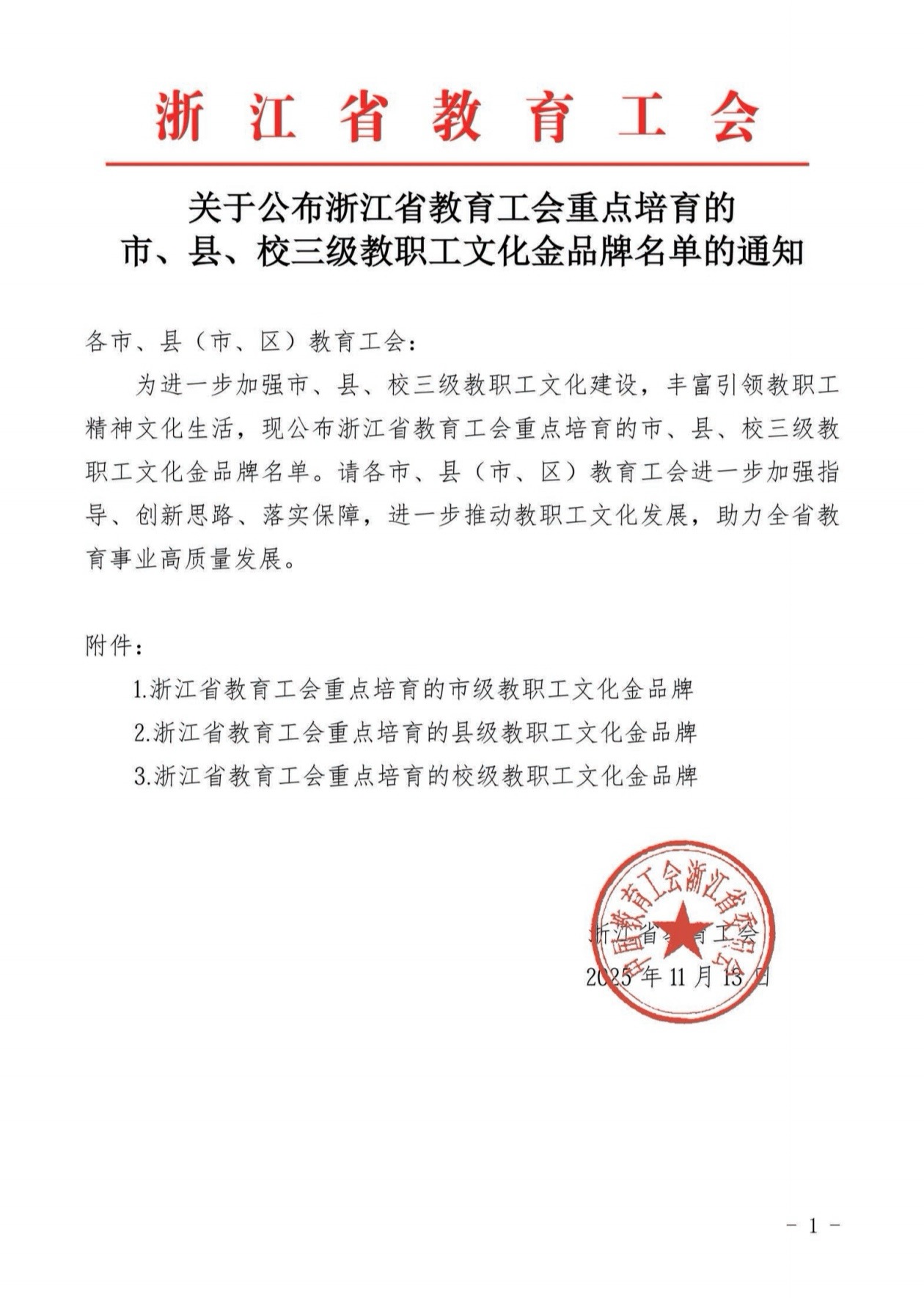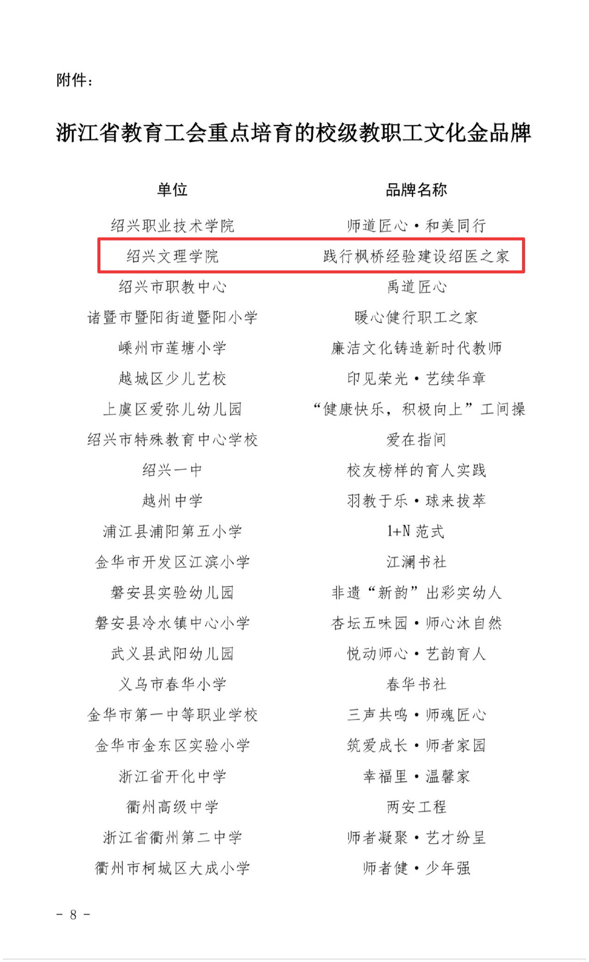 近日,浙江省教育工会公布了重点培育的市、县、校三级教职工文化金品牌名单(《关于公布浙江省教育工会重点培育的市、县、校三级教职工文化金品牌名单的通知》),校工会选送的“践行枫桥经验 建设绍医之家”榜上有名,获批浙江省教育工会重点培育的学校教职工文化金品牌,为我校创建星级工会再添一抹亮色。
