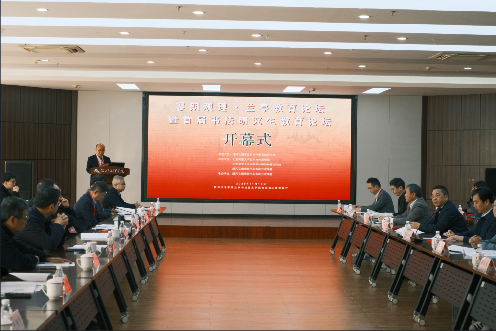 为促进全国书法研究生教育的学术交流与合作,探索书法专业研究生培养的学理建构与方法创新,由绍兴文理学院兰亭中国书法研究院发起,北京师范大学艺术与传媒学院、北京语言大学中国书法国际传播研究院、绍兴文理学院兰亭书法艺术学院共同举办的“寥朗观理·兰亭教育论坛暨首届书法研究生教育论坛”于11月15日成功举办。来自北京师范大学、北京语言大学、中国美术学院、浙江大学等八所高校的专家学者、研究生,以及绍兴文理学院领导与师生代表共100余人参加。