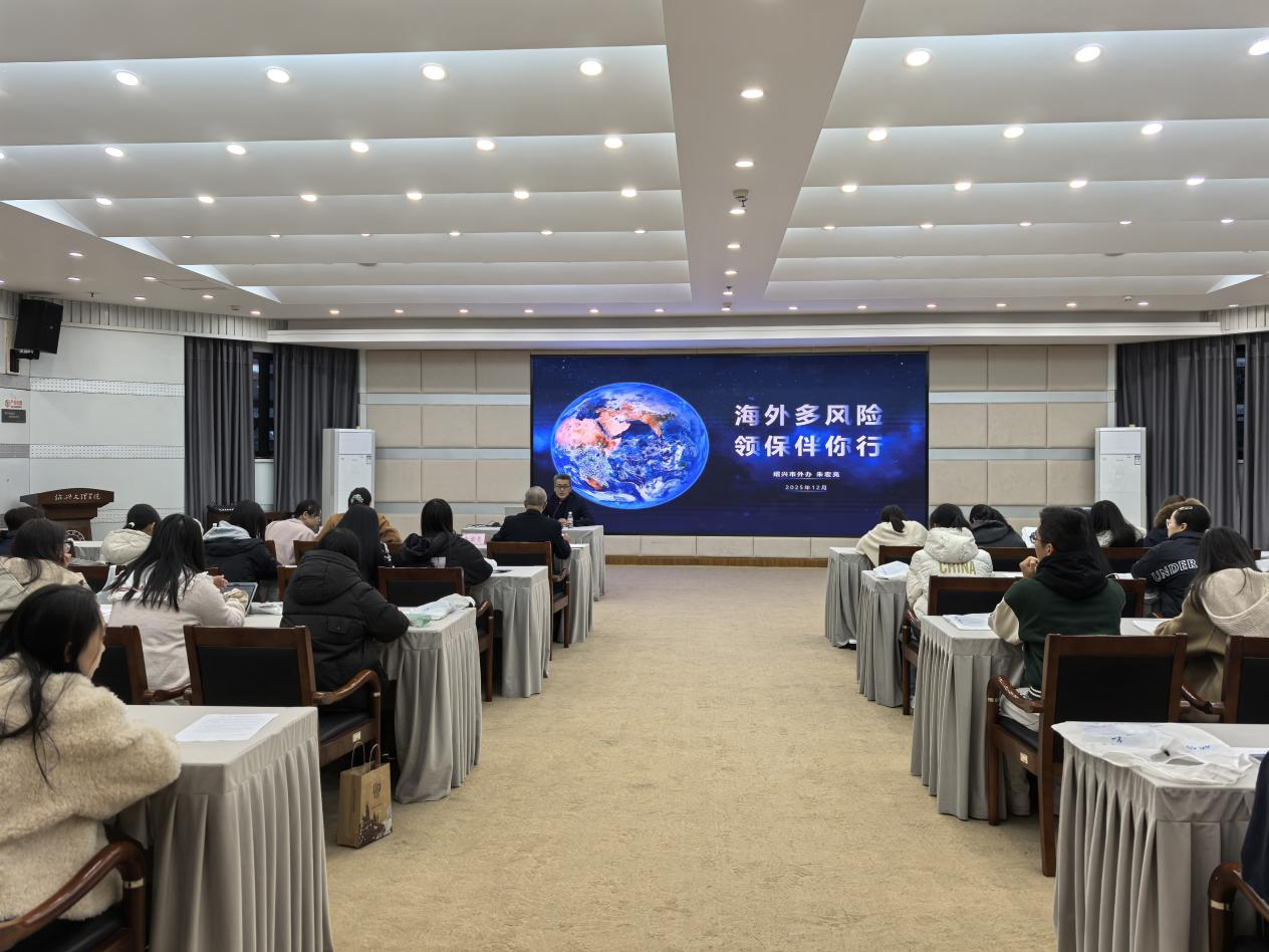 绍兴市外办领事签证处一级主任科员朱宏亮作《海外多风险领保伴你行》专题授课。他结合真实案例,系统讲解了领事保护的范围与求助方式,指导学生如何在外规避风险、遇事如何寻求有效帮助,并重点介绍了“外交部12308”领保热线等官方求助渠道。现场还分发了《中国领事保护与协助指南》等实用材料,为同学们的海外学习生活提供了及时而专业的指导。