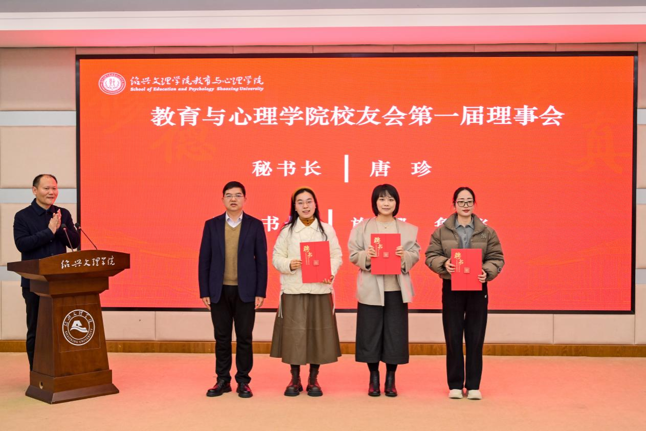 地方合作处处长、校友总会秘书长陈剑波宣读《关于同意成立绍兴文理学院校友总会教育与心理学院分会的批复》,并为第一届理事会秘书长、副秘书长、理事颁发聘书。应用心理学专业2014届校友唐珍介绍校友会筹备工作情况。会议审议通过《绍兴文理学院校友总会教育与心理学院分会章程》《绍兴文理学院校友总会教育与心理学院分会第一届理事会成员名单》。