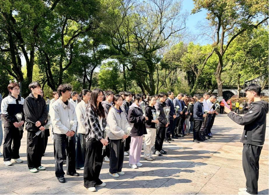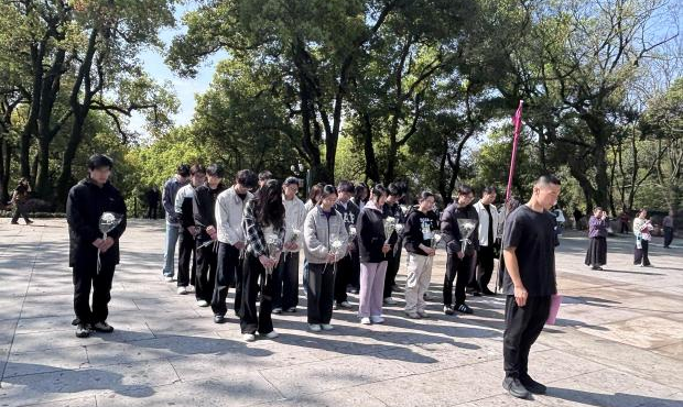 默哀毕,师生们手持白色菊花,依次向革命先烈敬献鲜花。一束束鲜花,代表着后辈对英雄的无限敬仰;一次次鞠躬,承载着青年一代对历史的深沉铭记。