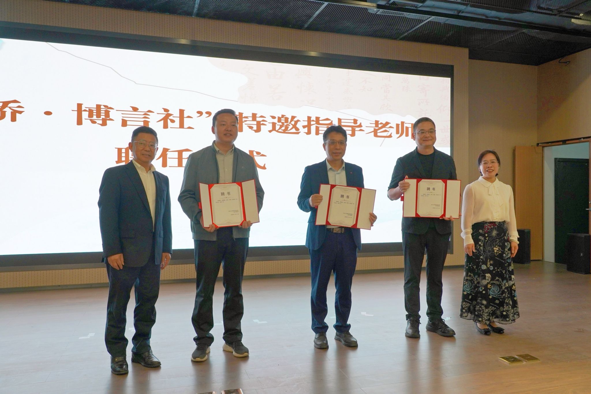 绍兴大学党委委员、宣传部部长宋浩成,绍兴市文广旅游局副局长戚建刚共同为“越桥・博言社”揭幕,国际教育学院院长俞国芬、绍兴博物馆馆长何鸣雷为特邀指导专家颁发聘书,标志着校馆合作、非遗育人新平台正式启用。