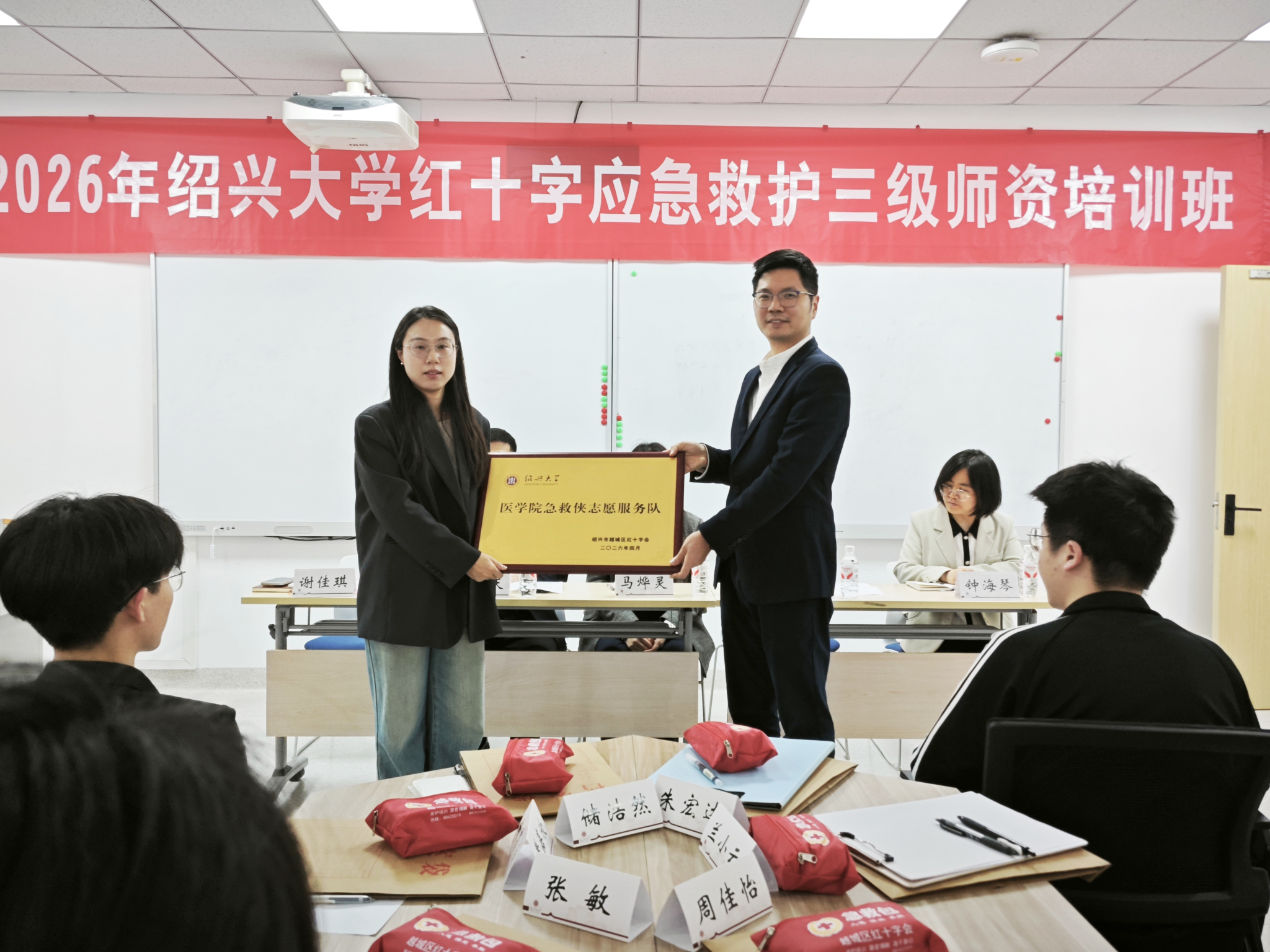 开班仪式上,宋健飞为“绍兴大学医学院急救侠志愿服务队”授牌,医学院团委书记、志愿服务队队长谢佳琪代表志愿队接牌。志愿队的成立,是学校率先响应中共浙江省委社会工作部、浙江省红十字会《关于发挥急救侠队伍作用提升“救在身边”公共服务水平的工作方案》和绍兴市《关于推行急救侠志愿服务模式的实施方案》的举措,也是学校红十字会基层组织建设的一项创新成果。宋健飞指出,绍兴大学作为越城区最为重要的急救教育阵地,近年来在应急救护培训、志愿服务、科普宣传等方面走在前列。“急救侠”队伍的成立,为高校青年参与生命守护搭建了实践平台,希望队员们练就过硬本领,成为校园和社区应急救护的“第一响应人”。