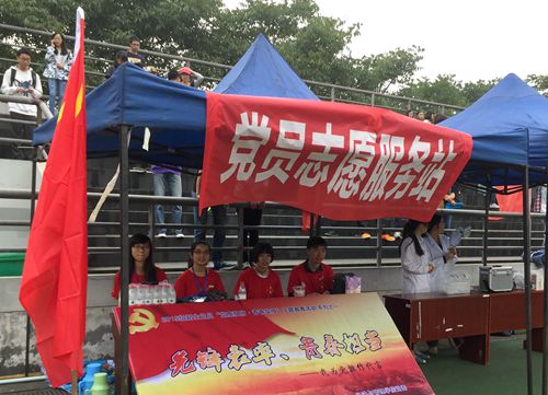循着他们的身影而去,发现在运动场的一角,有一处“党员志愿服务站”,鲜红的党旗随风飘扬,“先锋表率、青春担当”几个大字特别显眼。经了解,他们是我校2015级的新生党员,正在参加由学校党委组织部主办的新生党员教育系列活动。在运动会期间,53名新生党员轮流值班,为运动员提供温开水、搀扶等服务,向广播台投稿、宣传正能量,在运动场上巡查清理垃圾和障碍物,用实际行动投身运动会志愿服务、参与文明校园建设。
