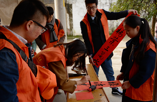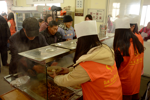 来到雨花斋,同学们首先被其极具人文气息的装饰所吸引,正面墙壁上挂着孔子的画像,旁边是“感恩词”和“雨花五了”,墙壁四周挂着传统文化的书画和名言警句,让人感觉非常神圣与平和;随后“雨花斋”志愿者鲁老师简要介绍了雨花斋的运行情况,并对如何做一名合格志愿者进行礼仪培训。培训结束,我们的学生党员们分成五组,投入到各自的工作中。礼仪组分列大门两旁,对每一位进出群众行礼迎接、欢送;卫生组对雨花斋四周的环境卫生进行清理;盥洗组负责餐具的清洁整理;餐饮组在厨房帮忙厨师们准备菜肴米饭;美工组为当地居民撰写“福”字、春联;文艺组则给渐渐多起来的当地居民分发了《大禹纪念歌》歌词、现场教唱《大禹纪念歌》,还带去了诗歌朗诵《大地情深》、小组唱《在金色的阳光下》、手语歌曲《感恩的心》等,热热闹闹、欢欢喜喜,赢得当地居民的阵阵掌声。