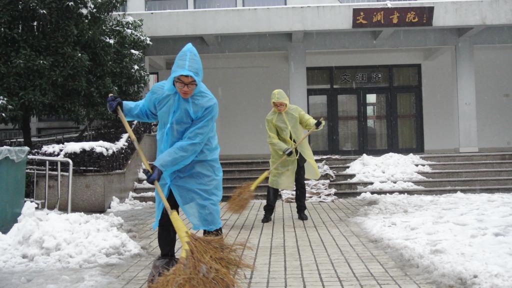 正值学生放假的日子,有学生干部主动更换回家车票,要求留下来为书院服务,也有路近的学生干部不畏风雪特意从家里赶回来参加服务工作。早上雪还未曾堆积时,他们便主动为回家的同学搬运行李。雪堆积起来后,便开始清扫。由于条件限制,除雪工具只有铁锹和扫把,加上零下3℃的低温,使得除雪工作更加艰难,但这并没有影响大家的工作热情。在书院老师的带领下,学生干部充分发扬了吃苦耐劳、顽强拼搏的战斗精神,团结协作,顶着寒风,耗时两个多小时,清扫了文澜书院5幢学生公寓通向学校主干道的积雪。师生们热火朝天,干劲十足地扫雪身影获得了路人连连称赞。