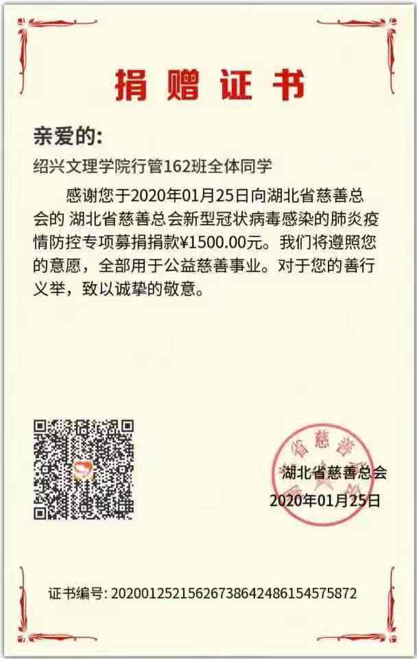 1月25日,农历正月初一,针对湖北省前线医院医疗资源紧张的情况,商学院行政管理162班团支部、班委会立即在班级QQ群中号召全班同学,自愿缴纳“特殊班费”,收齐后统一以“绍兴文理学院行管162班全体同学”的名义,在线参与“湖北省慈善总会新型冠状病毒感染的肺炎疫情防控专项募捐”。