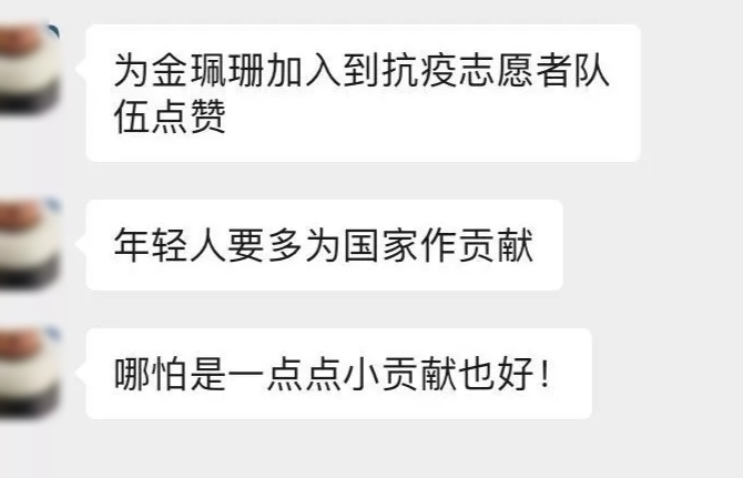土木191班的团支书金珮珊同学,得知疫情防治任务艰巨,也想尽一份自己的绵薄力量。她在爸爸的鼓励下,积极参与到所在社区嘉兴市独山港镇优胜南区的疫情防治志愿活动中。她说,报名参加志愿的人很多,有些志愿者甚至主动请求参加午夜班的轮班。这让她既感动也很受激励,特殊时期大家同心协力,一定可以早日战胜疫情!