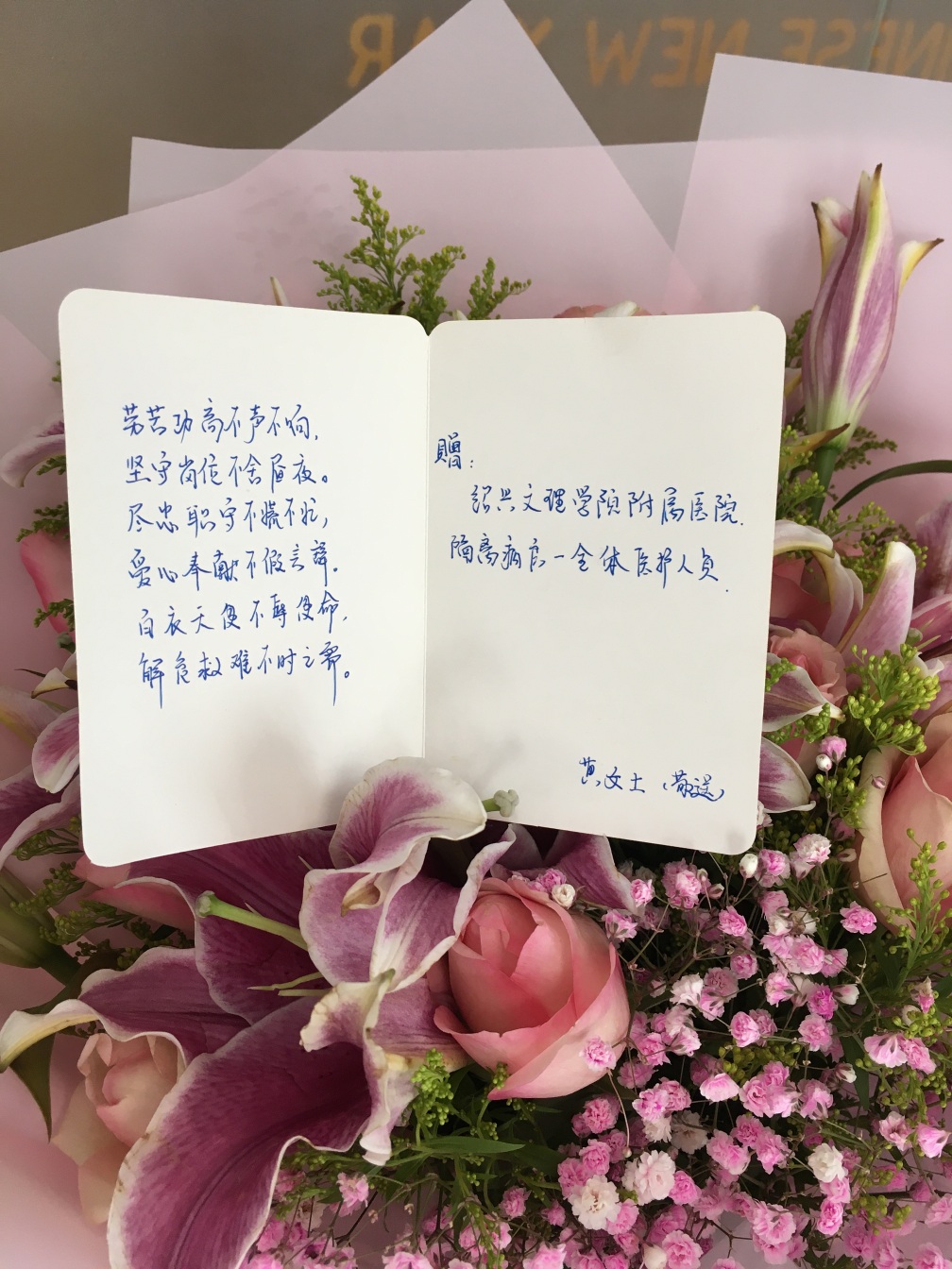 2月16日下午,我校附属医院隔离病房一病区的医护人员们欣喜地收到了一束来自出院患者的鲜花,这是15号刚从隔离病房解除隔离的黄女士送来的,诗歌般的谢词,表达了黄女士对医护人员无比的感恩和敬佩。