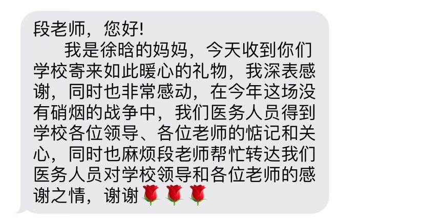 一位抗疫一线元培学生家长收到慰问礼品后对元培学院表示感谢