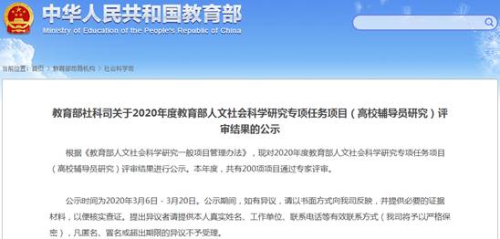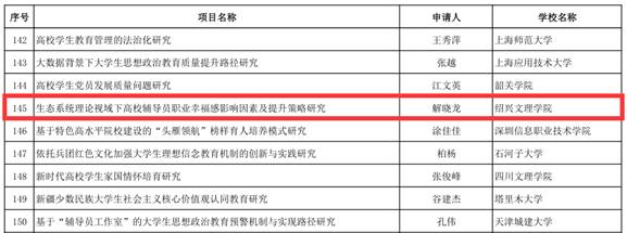 科研立项新突破。学院辅导员解晓龙老师获批2020年度教育部人文社会科学研究(高校辅导员专项)项目。3月6日,教育部社会科学司公示了2020年度教育部人文社会科学研究专项任务项目(高校辅导员专项)评审结果。本年度共有200项项目通过专家审核,解晓龙老师之前申报的《生态系统理论视域下高校辅导员职业幸福感影响因素及提升策略研究》成功入选。解晓龙长期从事高校辅导员工作,十分注重围绕本职工作开展科学研究,对于学生心理健康、辅导员队伍建设等方面有一定的钻研和思考。该项目立足于习近平总书记在2019年3月18日学校思想政治理论课教师座谈会关于“发挥思政课教师积极性、主动性、创造性”重要讲话精神,旨在针对高校辅导员队伍建设有效激励机制的建立作出有价值的积极探索。