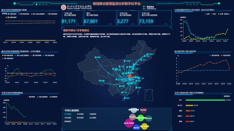 近日,元培学院东盟经济研究院内,最新一日全球主要国家和地区新增确诊病例数、各类病例累计数量较前一日变幅以及未来预测走势等多项数据在巨型电子屏上详细显示着,并不断有更新后的数字和智能文字实时在屏幕上“跳动”,各色图表、数据线构成了一张全球与全国新冠肺炎疫情信息数字化“大地图”。据介绍,这是东盟经济研究院基于人工智能图文分析技术打造推出的新冠肺炎疫情监测分析数字化平台,旨在助力数字化抗疫精准发力,为抗击疫情提供专业化支撑。